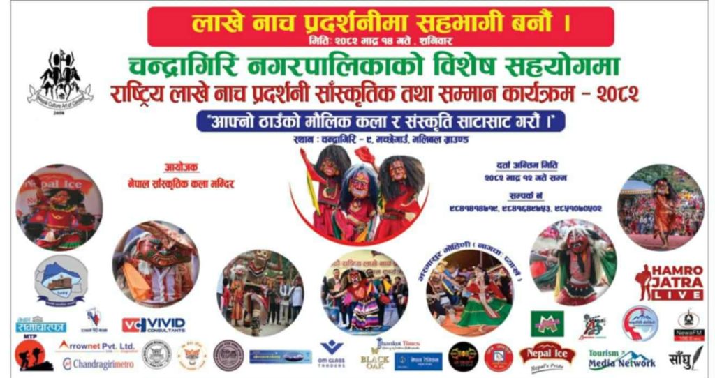 निराज रानाभाट, काठमाडौं । नेपाल सांस्कृतिक कला मन्दिर, मच्छेगाउँको आयोजना र चन्द्रागिरि नगरपालिकाको विशेष सहयोगमा ‘ आफ्नो ठाउँको मौलिक कला र संस्कृति साटासाट गरौं ’ भन्ने मूल नाराका साथ ‘ राष्ट्रिय लाखे नाच प्रदर्शनी साँस्कृतिक तथा सम्मान कार्यक्रम – २०८२ ’ हुने भएको हो । राजधानी काठमाडौंको चन्द्रागिरि नगरपालिका -९, मच्छेगाउँस्थित भलिबल ग्राउण्डमा भदौ १४ गते, शनिबार गर्न लागिएको आयोजकले जनाएको छ । आज चन्द्रागिरि नगरपालिकाका प्रमुख घनश्याम गिरीले, नगर प्रवक्ता एवं वडा नम्बर -४ का वडाध्यक्ष कृष्ण प्रसाद खड्गीले प्रदर्शनीको ब्यानर सार्वजनिक गरेका छन् ।