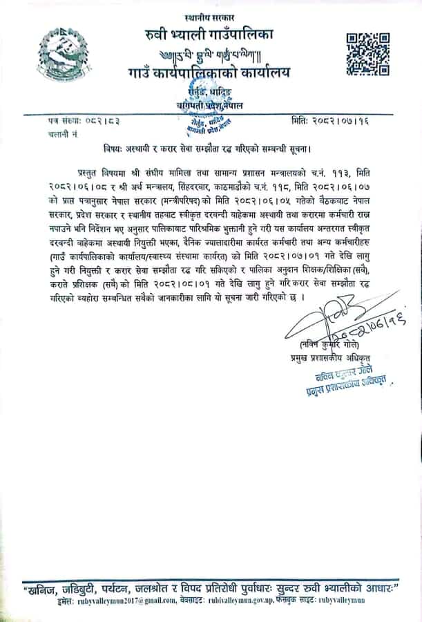 उक्त निर्णय अनुसार,गाउँकार्यपालिकाको कार्यालय तथा स्वास्थ्य संस्थामा कार्यरत अस्थायी नियुक्ति प्राप्त र दैनिक ज्यालादारीका कर्मचारीहरूको मिति २०८२।०७।०१ देखि सेवा सम्झौता रद्द गरिएको हो ।